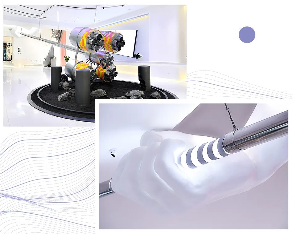進入展廳,一道紅光閃爍-鳳翅和鳴映入你的眼簾 ,造型靈感來源于鳳凰羽毛跟鳳凰之眼,向右順勢看去,一只強有力的拳頭(凱撒大帝之手)從天花伸出,延生過去就是神六之光,3個概念裝置,全部用鋁材制作,造型復雜,既要保證效果也要考慮安裝跟連接的牢固性,技術及安裝難度很大。項目部在施工現場一次又一次地嘗試,不斷調整,確保不出絲毫偏差。