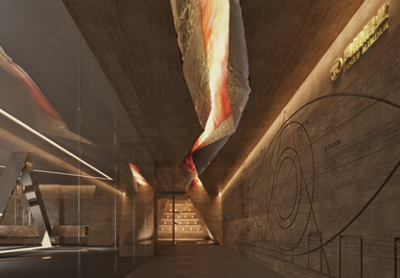 企業成長是必定經歷種種坎坷的,猶如一段“歷天火而開天地”的涅槃艱辛過程。道路上方由火光躍動的LED屏幕與裂開的天花作為序章。天花側面是鋁材原材剖面藝術展現,空間右側蝕刻著企業的大事記,展示著企業孜孜奮斗的華美篇章。