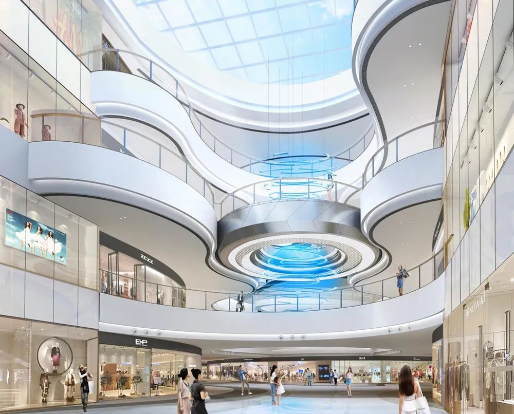 在整個購物中心的空間布局上,在原標準平面空間的基礎上打破了傳統的洞口布局,入口處將入口洞口與圓形中庭洞口在空間上鏈接形成一個整體流動性空間,讓整個入口的人流導向性更加明顯,加上入口處空間上的挑臺錯綜交并形成商鋪外擺區域,在營造商業空間氛圍的基礎上將空間造型與商業價值體現完美的合二為一,營造更有沖擊力的視覺體驗,使消費者逛街更具體驗感和舒適感。