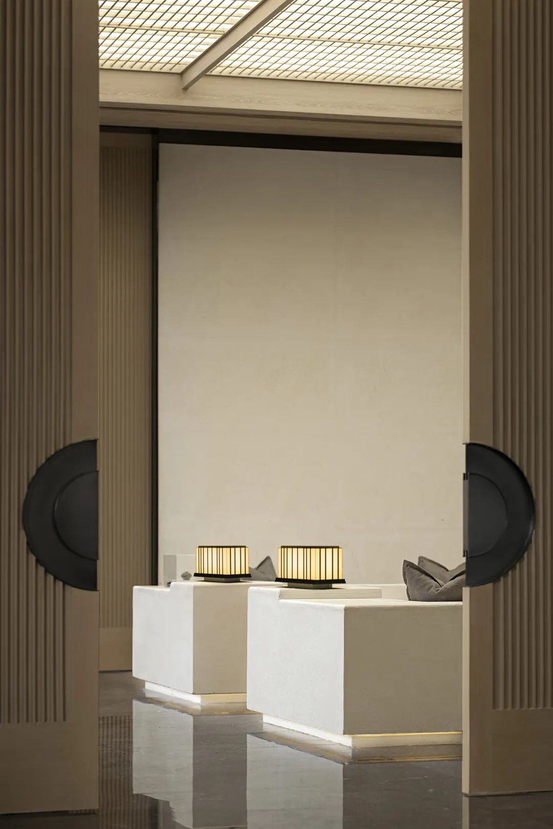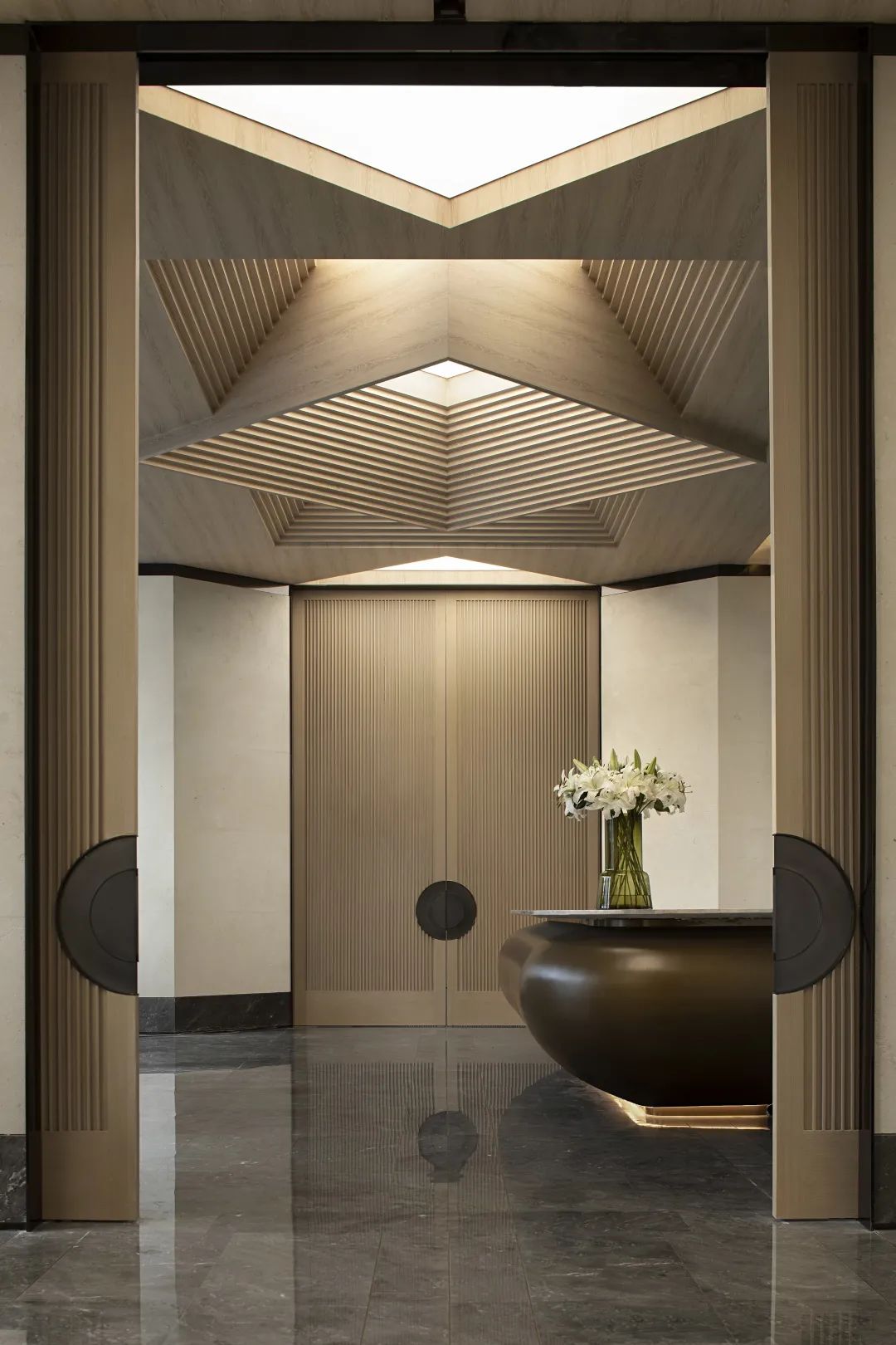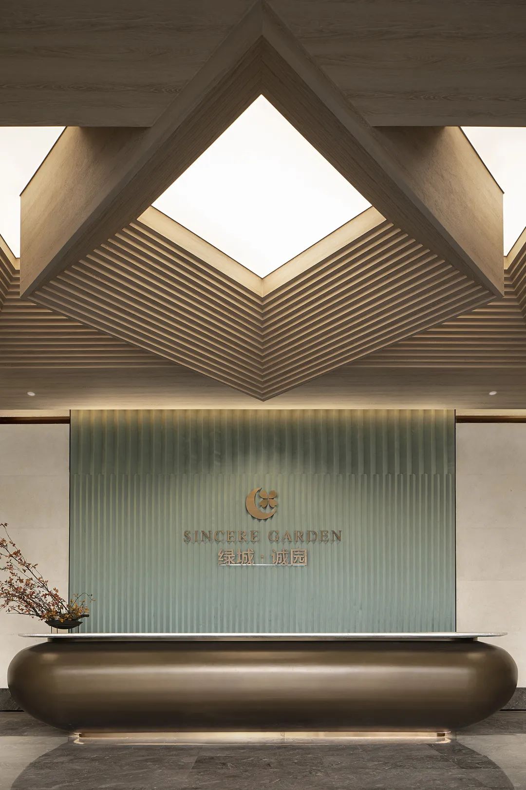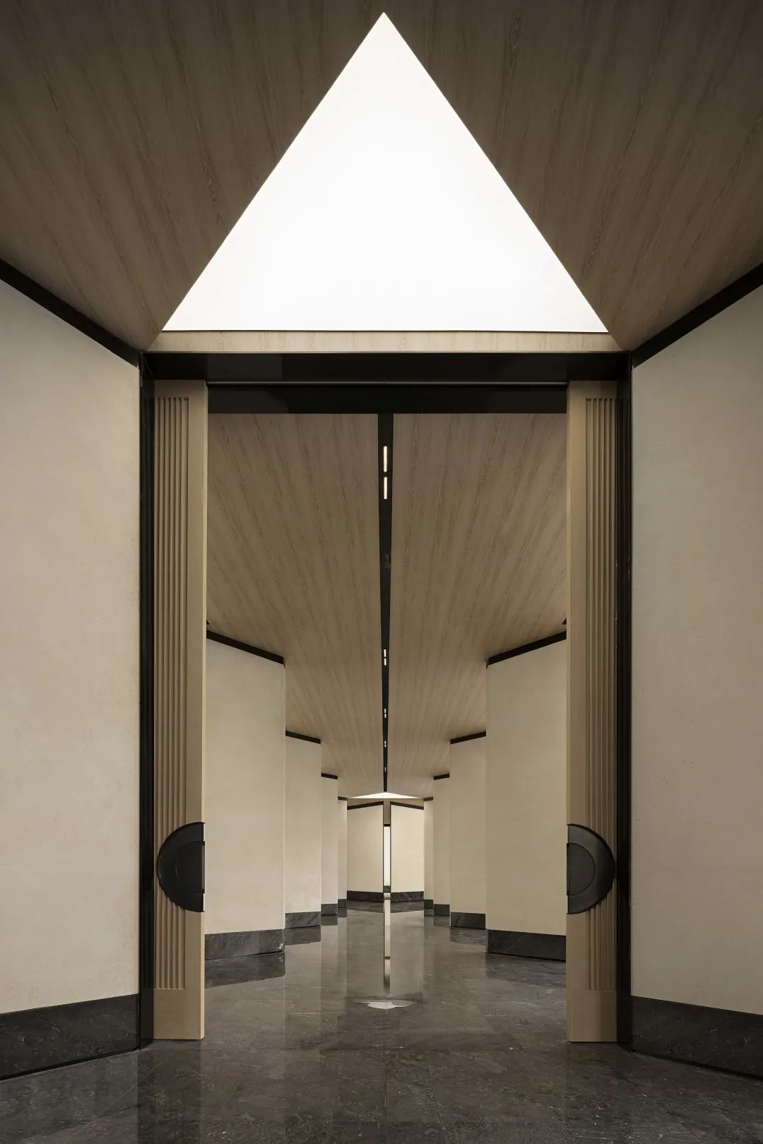 接待前廳設計靈感來源于對人與自然的重新思考,人必須知道自己身在何處,同時在環境中認同自己才能獲得自己的立足點。對稱的鏡像布局,鋸齒疊線的序列,樸素空間中散發出神性的光芒。