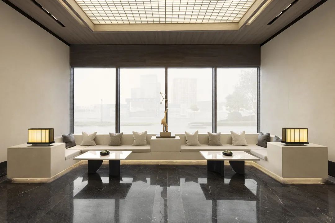 洽談區的屋頂使用發光軟膜,柔和了整個空間的光影。在這里剝離建筑張力,建立純粹立體的空間質感。在洗禮、沉淀的同時,尋找靜謐深邃的安寧之境。