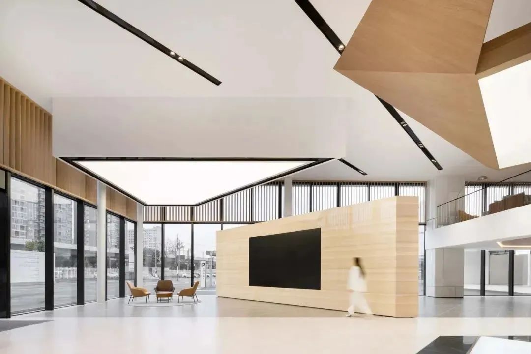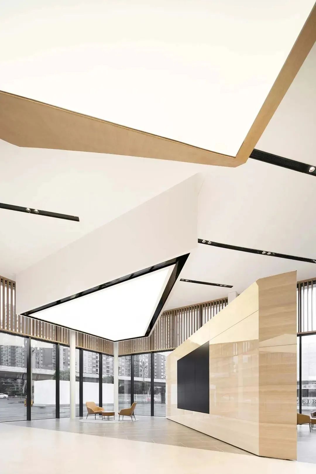 本項(xiàng)目注重“公共性”和“開放性”,將建筑景觀界面延伸交錯(cuò)的線性延伸至室內(nèi)天花、吧臺、樓梯斜切面,統(tǒng)一的線性交錯(cuò)特征,打破了功能空間的固定關(guān)系,將不同屬性的功能空間聯(lián)系起來,形成室內(nèi)與戶外的互動(dòng)對話。