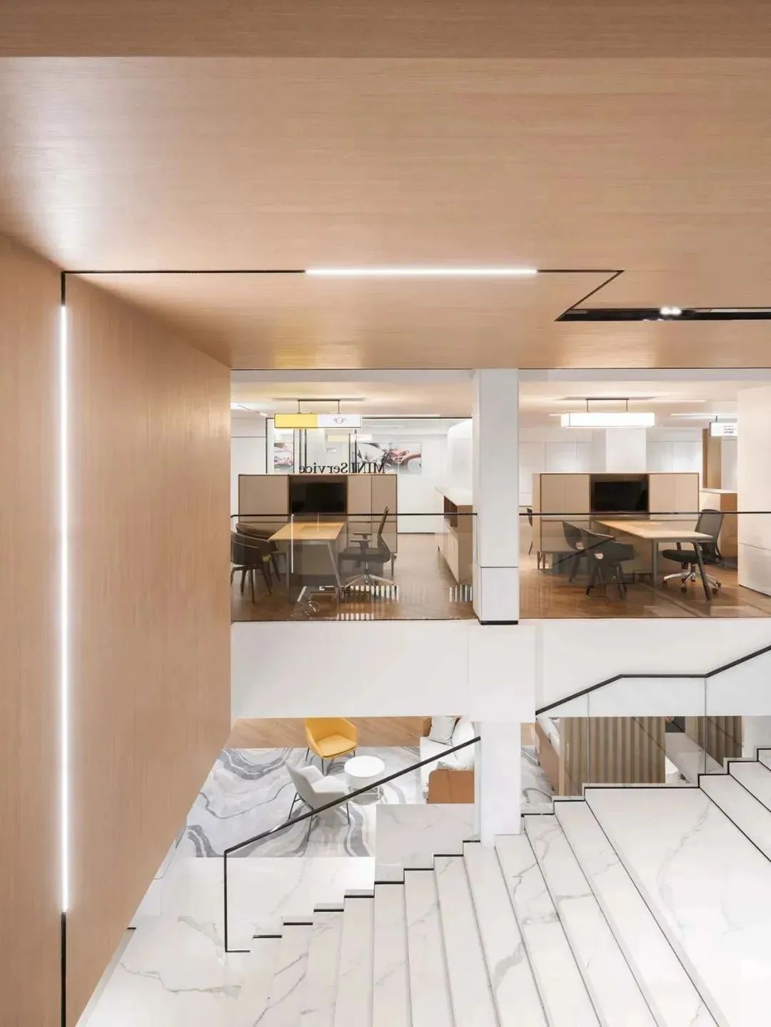 沿著階梯拾級而上,光影流轉(zhuǎn)、移步換景。二層的空間采用更加活潑跳躍的線性設(shè)計(jì)貫穿首尾,營造了一個(gè)更加靈活、開放、可變的社交空間,更是一個(gè)為探索空間、人、生活之間互相激活可能的存在,完美詮釋了趣味繽紛的生活本質(zhì)。