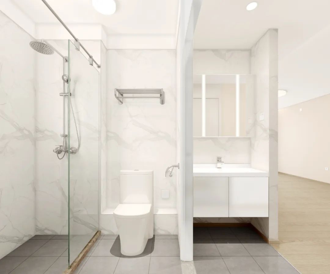 項目墻面采用自飾面硅酸鈣板,環保方面達到了E1級甲醛釋放標準。廚衛間墻板采取UV噴涂打印工藝,具有良好的防水、耐潮性能。室內機電采取管線分離、同層排水、干濕分區形式,有效避免了滲漏隱患,同時減少噪聲干擾。