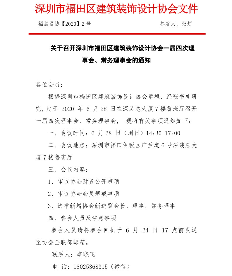 關于召開深圳市福田區建筑裝飾設計協會一屆四次理事會、常務理事會的通知